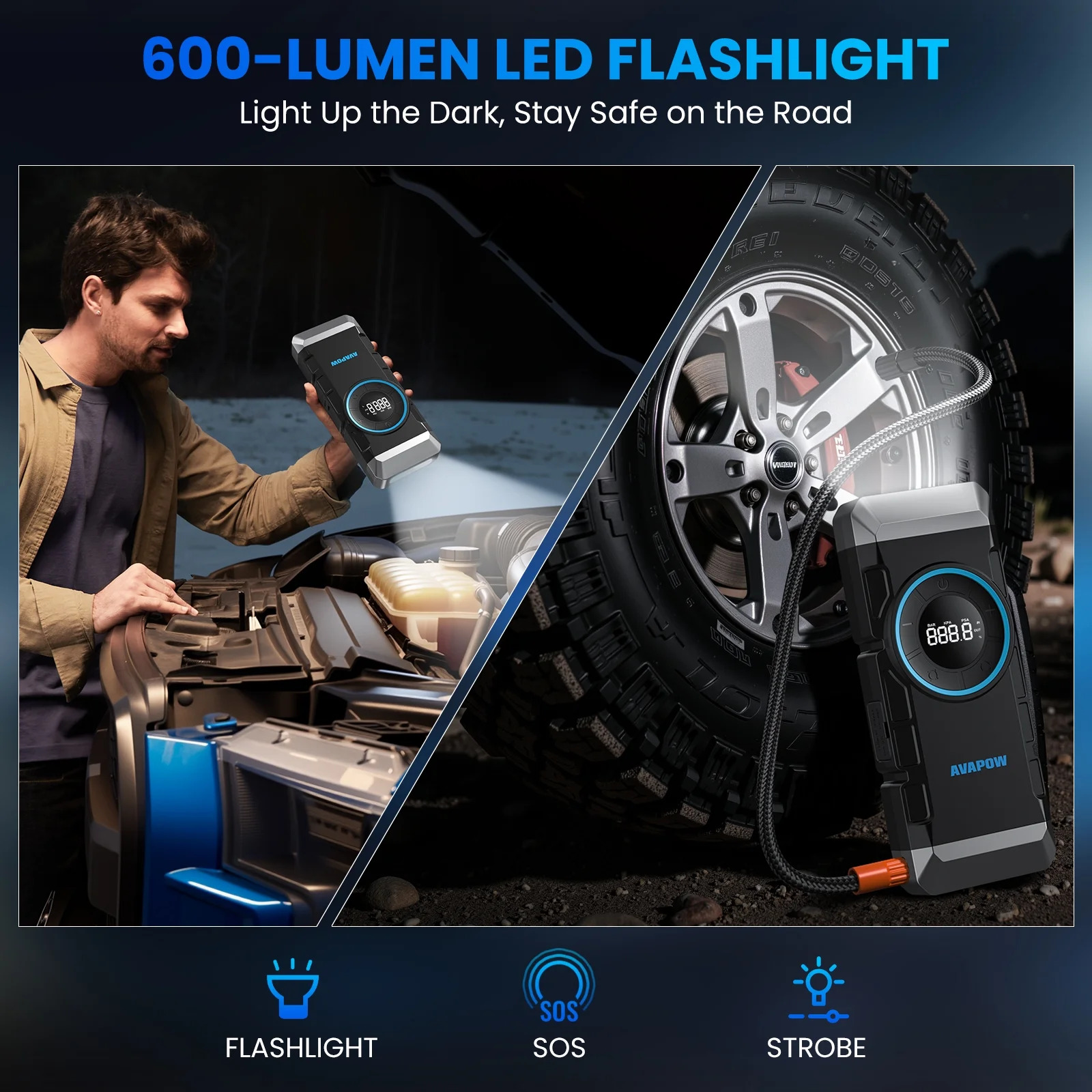 - Versatile Functions: Functions as an automobile battery charger, emergency starter, air compressor, 600 LUMENS LED camping light, emergency SOS tool, and portable mobile power source.