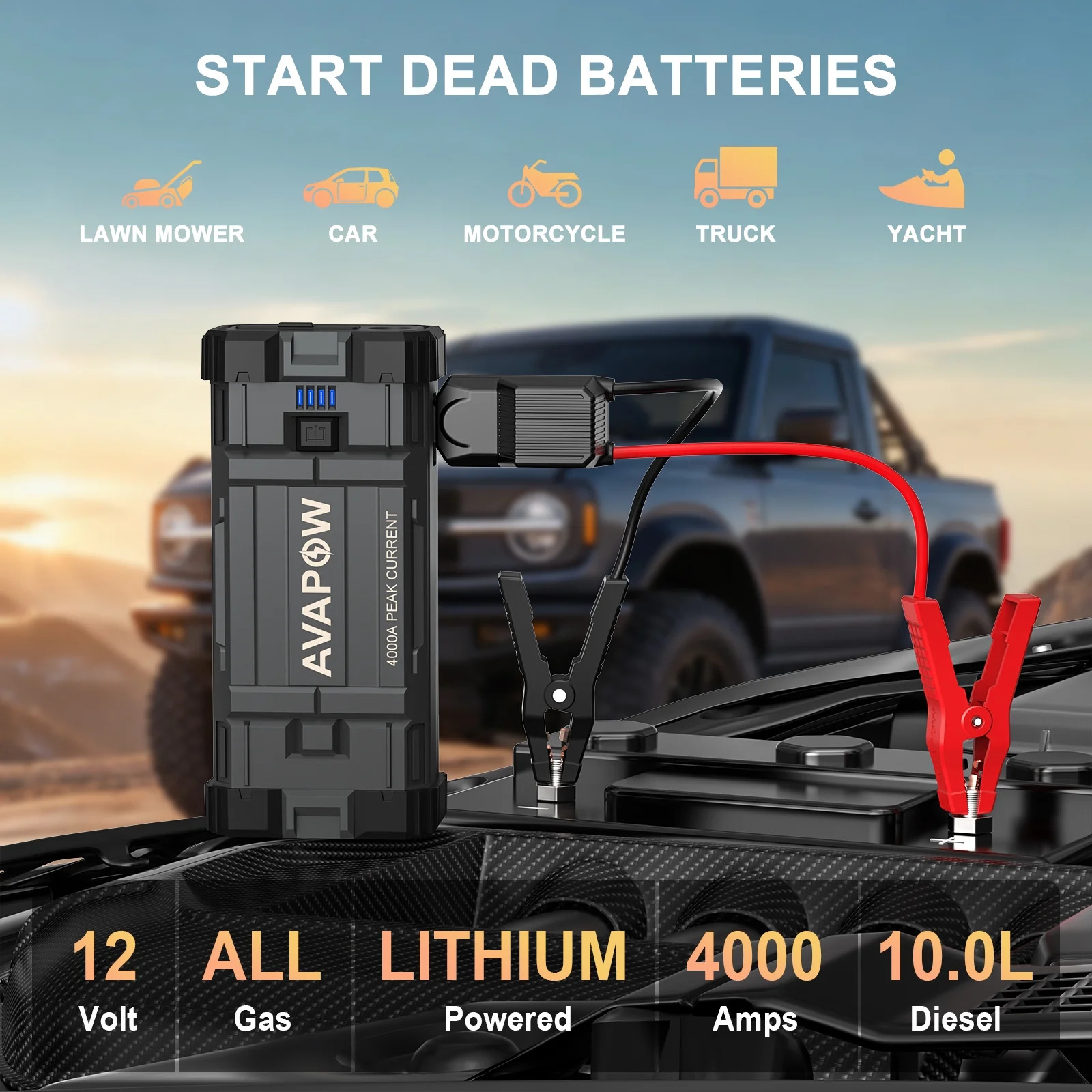 Be the first to review “AVAPOW Car Jump Starter, 4000A Peak 27800mAh Battery Jump Starter (for All Gas or up to 10L Diesel), Battery Booster Power Pack, 12V Jump Box with LED Light, USB Quick Charge 3.0” Cancel reply